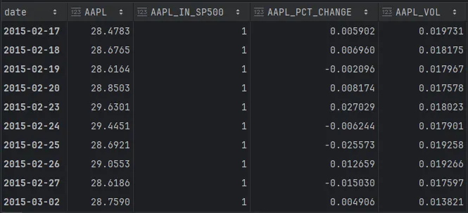 - Additionally, since we’re there, we’ll also calculate the daily percentage change (e.g. AAPL_PCT_CHANGE), which helps us determine the rolling volatility over 22 days (roughly a month), referred to as AAPL_VOL in our example.