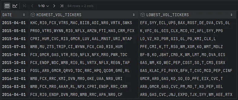 Next, we need to create two columns for the highest and lowest volatility tickers, as comma-separated strings, at the start of each month. These will only include stocks that were part of the S&P 500 on the first day.