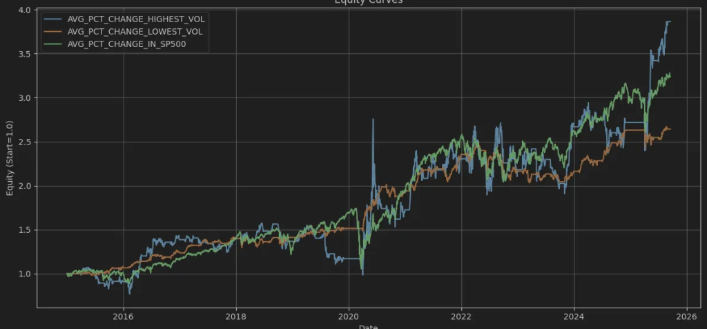 - For the highest and lowest stocks, I’m using the average percentage change to calculate returns and the equity curve, as we’re assuming equal investment in each stock.
