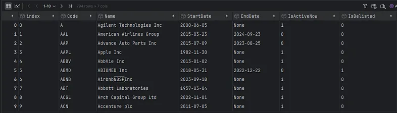 As you can see, we’ll use the EODHD API suite to retrieve the last 10 years of prices to date. For our backtesting universe, we’ll obtain the SP500 stocks. EODHD provides an endpoint that enumerates the current constituents of the S&P 500 as well as their historical memberships, including the respective start and end dates during which each stock was part of this prestigious index.
