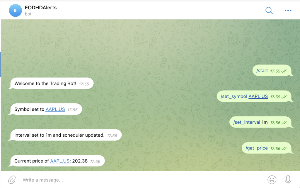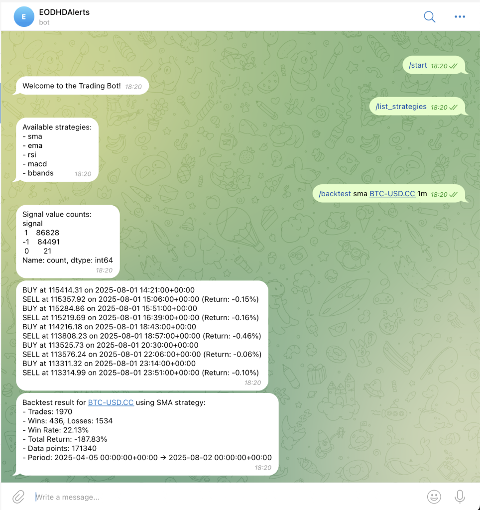 EODHDSignals is a free Telegram bot powered by EODHD data. It monitors your chosen tickers and sends Buy/Sell alerts using technical strategies. You can also check the latest price, switch strategies, and run backtests on historical data.