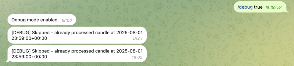 - Purpose: shows short status lines (for example, when the last processed candle hasn’t changed) so you can see the bot is running without spamming repeated alerts.
